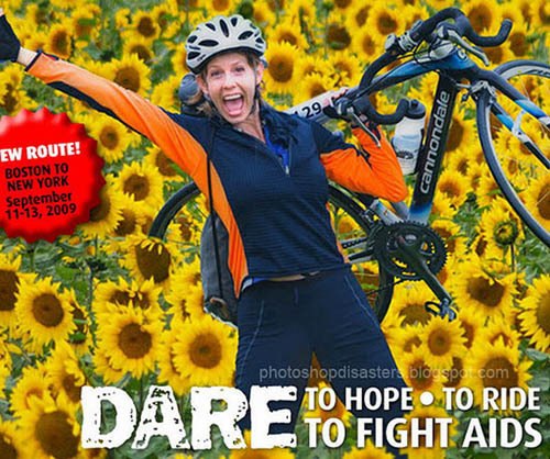 猜猜看是什么错误?其实就是过度的依赖photoshop的技术。看看上面的图片,我相信受众情不自禁的发现这个广告传导给我们的意思是“我可以准确的告诉你,我很想买它”。事后,当你发现原来这是一张鼓励艾滋病人为病魔斗争,进行自行车比赛的宣传海报的时候,小编和你一样,都心碎了。让我们来分析下这张海报的细节部分。第一眼关注这张海报的时候你会注意到盛开的向日葵背景。但是它离自行车的距离过于接近。背景的过于绽放破坏了主体人物图片,打破了自行车的车轮和踏板的完整形态。