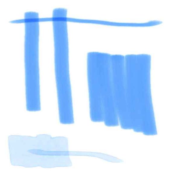 “仿真平笔”变体使您能够根据蜡版笔的握持方式画出粗细不同的线条。 如插图中所示,用此类画笔所画笔触的末尾都带有精细的鬃毛标记。 “仿真湿性平笔边缘”画笔变体可以沿着笔触边缘画出较淡色彩和浓重色彩。 “仿真湿性薄平笔”可以在基于现有作品进行绘画时方便您取色。