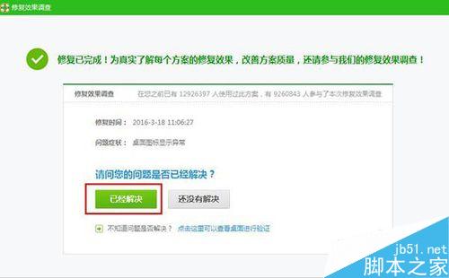 修复时间差不多一分多钟就可以了,修复完成系统会弹出提示。如果已完美解决问题,点击已经解决就可以了。