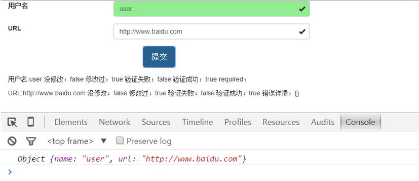 myForm.name.$dirty && myForm.name.$valid 当用户修改input的值了,并且验证成功了,我们给予正确的提示。