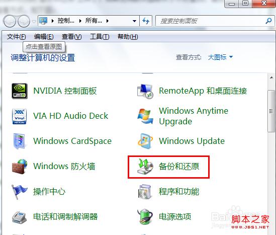 2、进入控制面板后即可找到“备份和还原”工具了,如果觉得默认图标太小不好查找,请点击控制面板右侧的“大图标”查看方式,如下图: