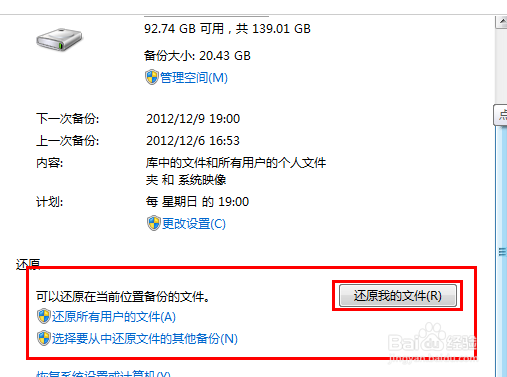 4、系统备份完了之后,我们再进入到备份设置里面,在底部就可以看到有还原入口了,在还原选项右侧即可看到“还原我的文件”这就是Win7还原入口,只要是上次有备份,后期就可以在这里点击还原,当然前提是我们不能把之前备份在D盘的备份文件给删除掉,这点希望大家留意下,点击还原后,会提示你之后要重启电脑完成,按照提示操作即可成功还原到之前备份的状态。