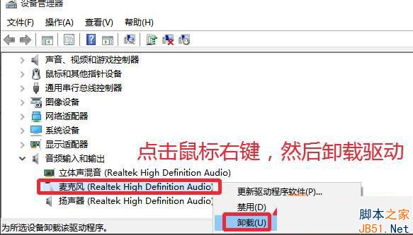 4、在设备管理器中展开“音频输入和输出”,将下面的声卡驱动单击右键,选择“卸载”;