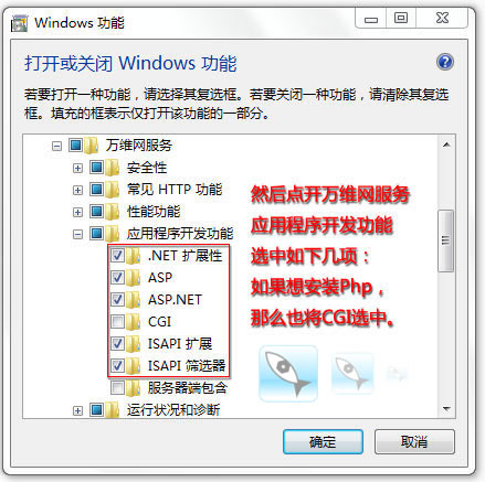 然后点开"万维网服务",点开应用程序开发功能,依次选中:.NET扩展性、ASP、ASP.NET、ISAPI扩展、ISAPI筛选器,如果想安装PHP,需要将CGI也选中。