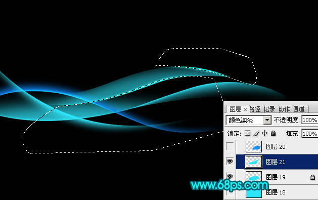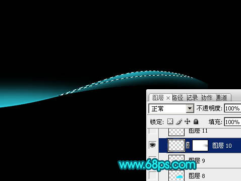 16、新建一个图层,用钢笔勾出下图所示的选区,羽化10个像素后填充青色,作为所有光束的高光。