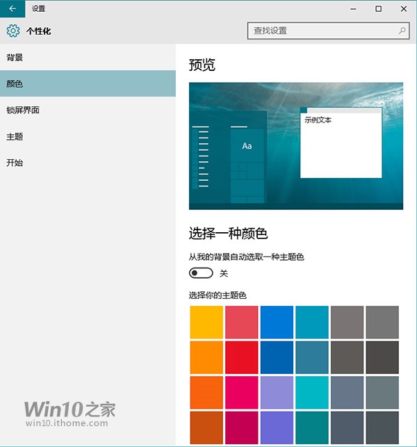 Win10中系统主题色有两个来源,一个是自动从背景图片中选择,另一个是从微软提供的若干颜色中选取。如下图所示: