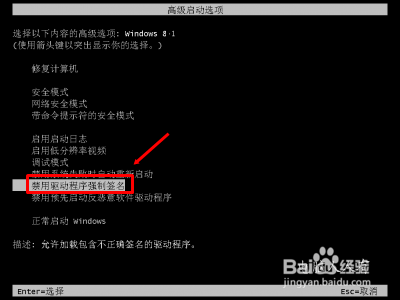 7、如果是多系统,且Windows 8.1操作系统不是主系统,就会有以下开机选择菜单。同样,在此开机选择菜单中点选 禁用驱动程序强制签名 选项,重启电脑即可。