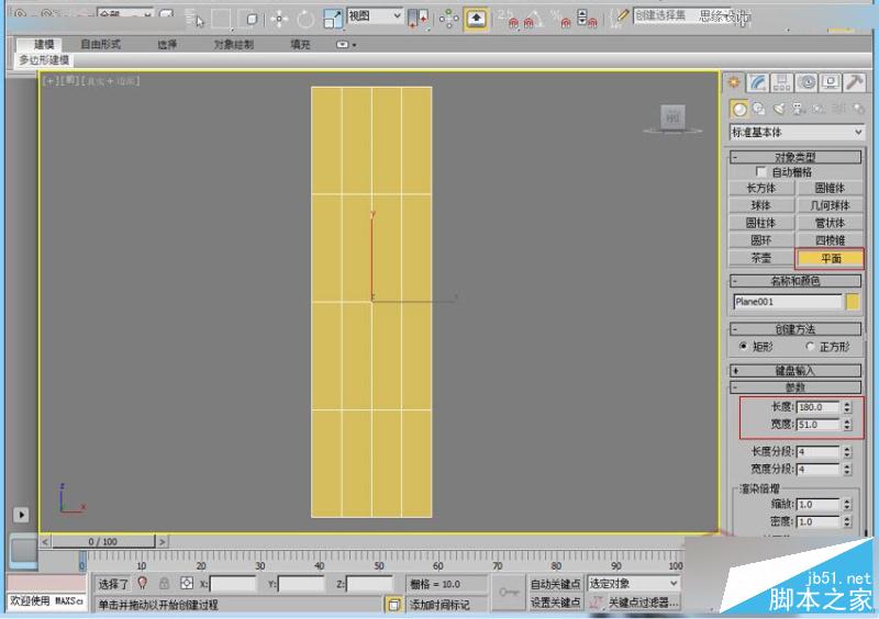 第二步,贴图制作好后,我们返回到max中,开始制作展台的外形,在前视图中我们创建一个平面,大家要是初学的话也可以根据我上面的参数来设定。