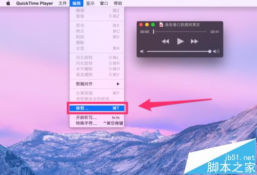 2、音频文件打开以后,在MacBook界面顶部菜单栏中找到“编辑”栏目,并从下拉菜单中找到“修剪...”这一栏,点击此项进入下一步。