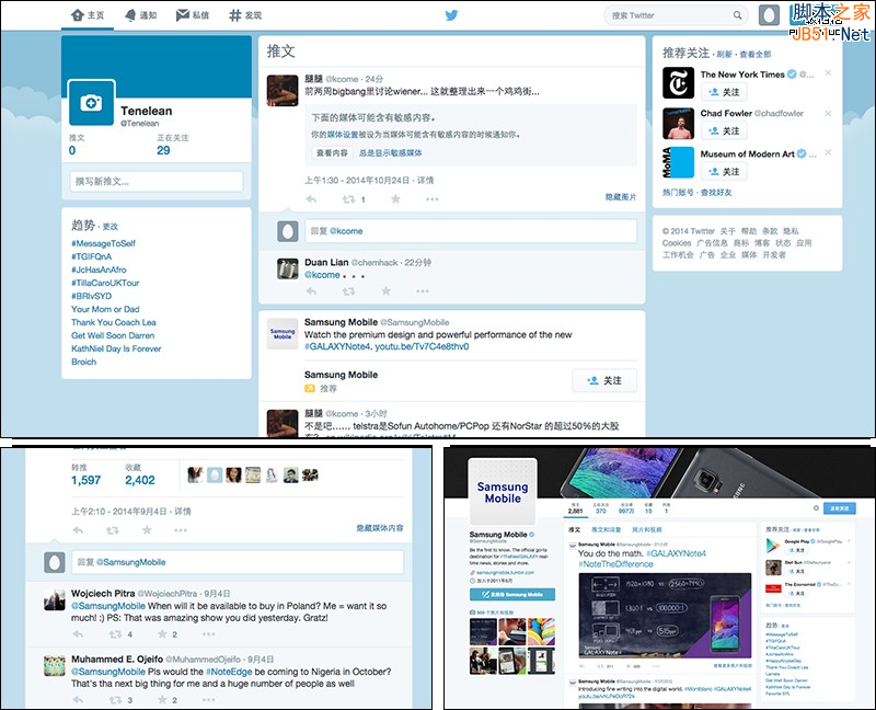 整体蓝色设计带来统一印象,颜色的深浅分别承载不同类型的内 容信息,比如信息内容模块,白色底代表用户内容,浅蓝色底代表回复内容,更深一点的蓝色底代表可回复操作,颜色主导着信息层次,也保持了twitter的品牌形象。