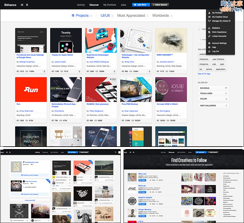 黑色突出网站导航和内容模块的区分,品牌蓝色主要用于可点击的操作控件,包括用户名称、内容标题。相较于大片使用品牌色的手法,更能突出 内容和信息,适合以内容为王的通用化、平台类站点。