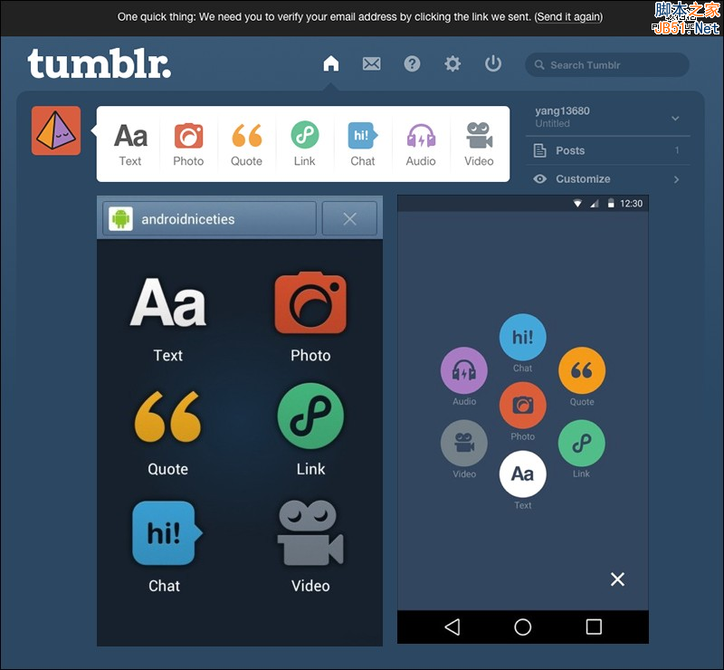 在实际的设计运用中,常会用些更综合的手法,例如整体有主导 色调,小范围布局会采用同色调搭配。拿tumblr的发布模块来说,虽然页面有自己的主色调,但小模块使用同色调不同色彩的功能按钮,结合色相变化和图形表达不同的功能点,众多的按钮放在一起,由于同色调原因模块非常稳定统一。