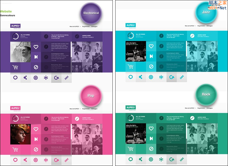 拿紫色界面来说,利用同一色相通过色调深浅对比,营造页面空间层次。虽然色彩深浅搭配合理,但有些难以区分主次,由于是同一色相搭配,颜 色的特性决定着心理感受。