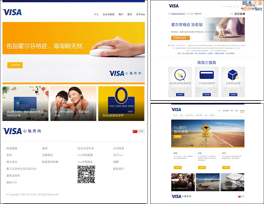 VISA是一个信用卡品牌, 深蓝色传达和平安全的品牌形象,黄色能让用户产生兴奋幸福感。另外蓝色降低明度后再和黄色搭配,对比鲜明之余还能缓和视觉疲劳。