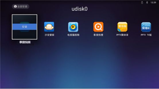 万一盒子没有自动识别U盘,请打开主界面的“应用”,进入“多媒体播放”,找到U盘并打开,也能找到泰捷视频安装文件,安装完成即可使用: