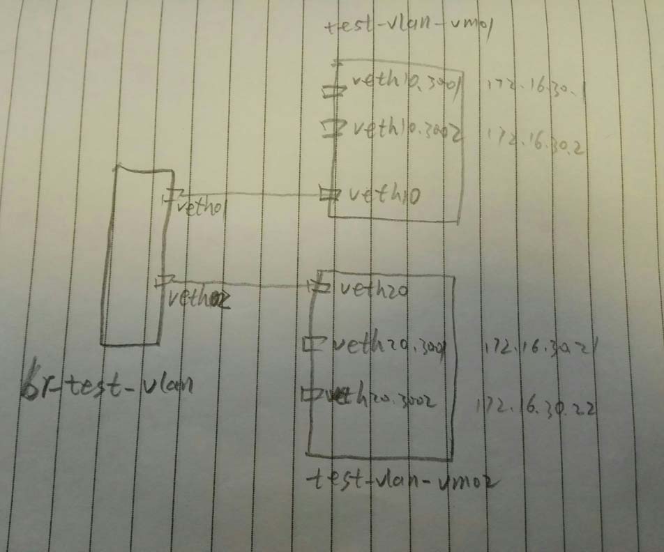 #创建网桥 brctl addbr br-test-vlan #创建veth对儿 ip link add veth01 type veth peer name veth10 ip link add veth02 type veth peer name veth20 #将veth对儿的一段添加到网桥 brctl addif br-test-vlan veth01 brctl addif br-test-vlan veth02 #启动设备 ip link set dev br-test-vlan up ip link set dev veth01 up ip link set dev veth02 up ip link set dev veth10 up ip link set dev veth20 up #创建网络名字空间 ip netns add test-vlan-vm01 ip netns add test-vlan-vm02 #将设备对儿的另一端添加到另个名字空间(其实在一个名字空间也能玩,只是两个名字空间更加形象) ip link set veth10 netns test-vlan-vm01 ip link set veth20 netns test-vlan-vm02 #分别进入两个名字空间创建vlan和配置ip #配置名字空间test-vlan-vm01 ip netns exec test-vlan-vm01 bash #配置vlan 3001 和 vlan 3002 vconfig add veth10 3001 vconfig add veth10 3002 #启动两个vlan的设备 ip link set veth10.3001 up ip link set veth10.3002 up #分别在两个vlan上配置ip (这里简单起见,使用了同一个网段了IP,缺点是,需要了解一点儿路由的知识) ip a add 172.16.30.1/24 dev veth10.3001 ip a add 172.16.30.2/24 dev veth10.3002 #添加路由 route add 172.16.30.21 dev veth10.3001 route add 172.16.30.22 dev veth10.3002 #配置名字空间test-vlan-vm02 ip netns exec test-vlan-vm02 bash #配置vlan 3001 和 vlan 3002 vconfig add veth20 3001 vconfig add veth20 3002 #启动两个vlan的设备 ip link set veth20.3001 up ip link set veth20.3002 up #分别在两个vlan上配置ip (这里简单起见,使用了同一个网段了IP,缺点是,需要了解一点儿路由的知识) ip a add 172.16.30.21/24 dev veth20.3001 ip a add 172.16.30.22/24 dev veth20.3002 #添加路由 route add 172.16.30.1 dev veth20.3001 route add 172.16.30.2 dev veth20.3002