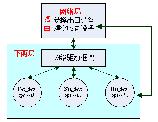 这里要注意的是,Linux下的网络设备net_dev并不一定都对应实际的硬件设备,只要注册一个struct net_device{}结构体(netdevice.h)到内核中,那么这个网络设备就存在了。该结构体很庞大,其中包含设备的协议地址(对于IP即IP地址),这样它就能被网络层识别,并参与路由系统,最有名的当数loopback设备。不同的设备(包括硬件和非硬件)的ops操作方法各不相同,由驱动自己实现。一些通用性的、与设备无关的操作流程(如设备锁定等)则被Linux提炼出来,我们称为驱动框架。