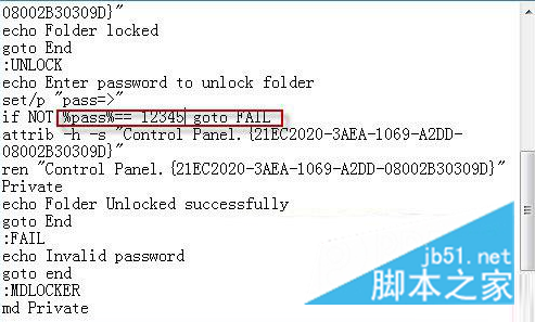 4、在上面的代码中,用自己想要的密码取代“PASSWORD_GOES_HERE”,比如:用12345,最后的效果是:if NOT %pass%== 12345 goto FAIL;