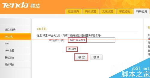 2、接下来切换到“特殊应用”-“DMZ主机”选项卡,在“DMZ主机IP地址”输入框中输入“迅雷赚钱宝IP地址”,勾选“启用”项,点击“确定”按钮。