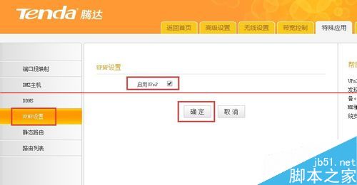 3、切换到“特殊应用”-“uPNU设置”选项卡,勾选“启用UPnp”项,点击“确定”按钮以开启UPNP功能。