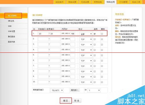 4、接下来再切换到“特殊应用”-“端口段映射”选项卡界面,在此“序号1”中输入如图所示的内容,勾选“启用”项,点击“确定”按钮,以定义迅雷赚钱宝端口映射。此时凡是通过Telnet登陆路由器WAN口的操作,均被定向到对迅雷赚钱宝对应端口的远程登陆操作。