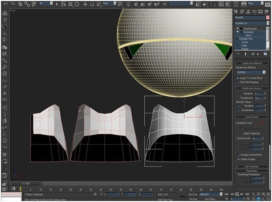 这跟制作胸部的方法非常地相似,但既然这对我来说是一个建模练习,于是我使用了一个14段位的球体。删除了一半,包括它的上边和侧边,然后开始建模。我想,根据实物的形状,你得有自己的判断,判断用什么方法来制作网格。是多边形或是其他你个人喜欢的方法,要说的话,当你为一部电话建模的时候也是一样,大部分都是这样的,如不不全都是长方体模型的话,但是如果你要完成一些更复杂、更有组织性的东西的时候,建议选择多边形建模。