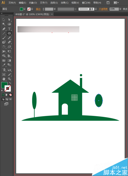 6、选择工具箱中的矩形工具,将填充设置为绿色,描边设置为无,在屋顶画一个矩形;再选择工具箱中的椭圆工具,按住shift键画一个正圆,这里也需要保证正圆的宽高度与矩形的宽度一样大。然后选中整体,按快捷键Ctrl+G编组。