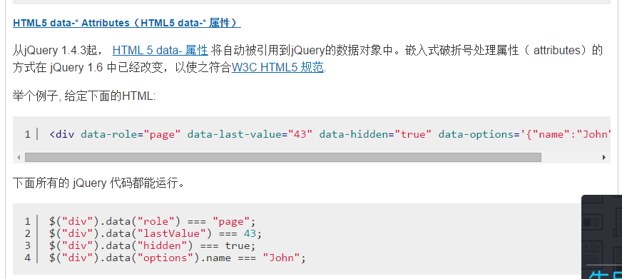 网上查了一圈,终于找到data-*的出处了,原来是Jquery和html5里面的,好东西,真是好东西!我们先来看看jquery的API