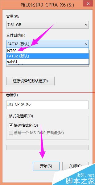 2、文件系统默认为FAT32,将其更改为NTFS,然后点击格式化。