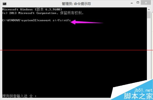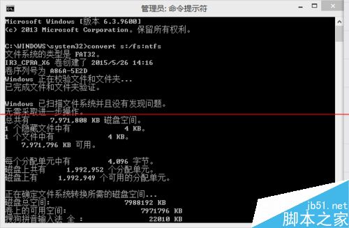 3、输入 convert s:/fs:ntfs (可复制,但记得修改)按回车,等待转换文件系统,(其中s:的s指的是第一步中的驱动号码)。