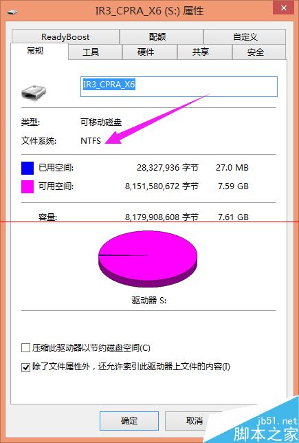 3、格式化完成后右键优盘--属性,发现文件系统改为NTFS;然后在进行复制便可以了