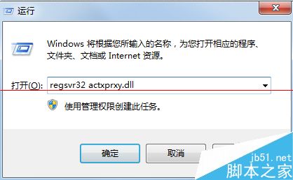 2、在运行对话框输入 regsvr32 actxprxy.dll 点击确定,进行注册,等待弹出注册成功对话框点击确定