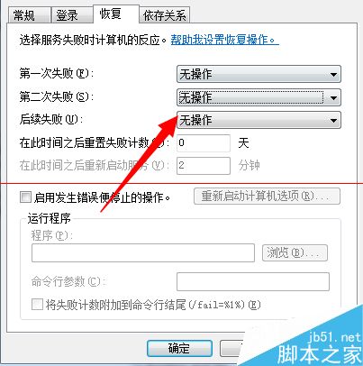 5、进入恢复界面将第一次失败,第二次失败,后续失败,后面的复选框,都选为无操作,点击确定即可