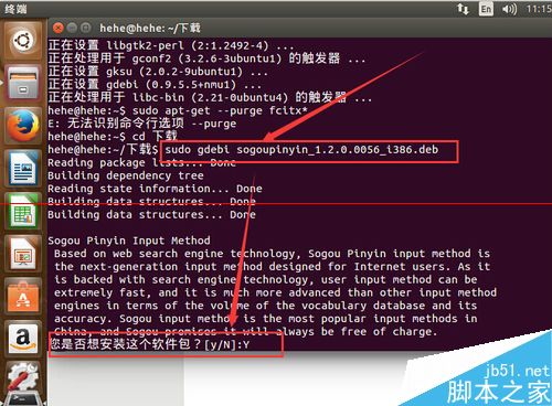输入:sudo gdebi so 然后按tab键补全搜狗的文件名称按,按enter执行后,等待某狗安装完成。如果期间提示“您是否想要安装这个软件包(Y/N)”,那么你输入“Y”然后按回车键就可以了