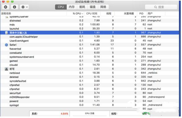 方法二: 如果第一种方法对你无效,请将输入法切换成美式输入法,然后打开activity monitor,将其中的中文输入法任务中止。回到输入法切换项,将输入法切换回中文输入法,即可。