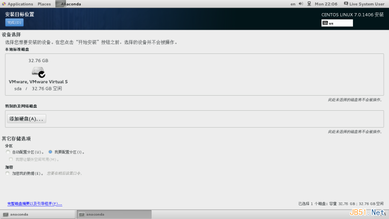 第一步、安装CentOS 7,进入安装界面后,一定要自己配置分区,如下图: