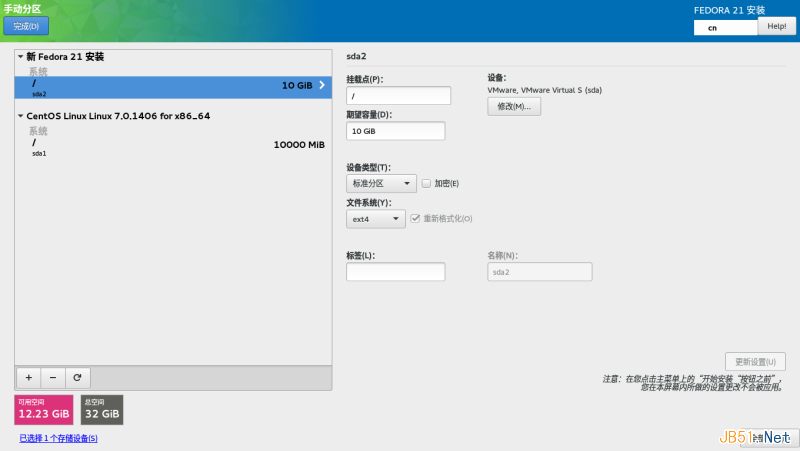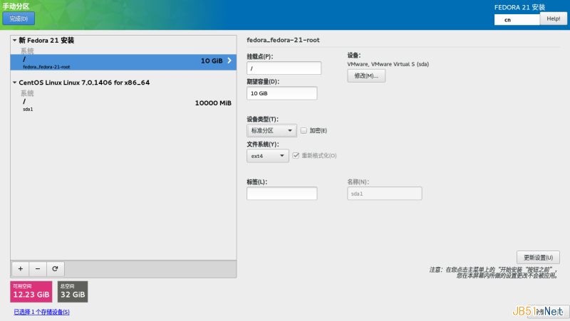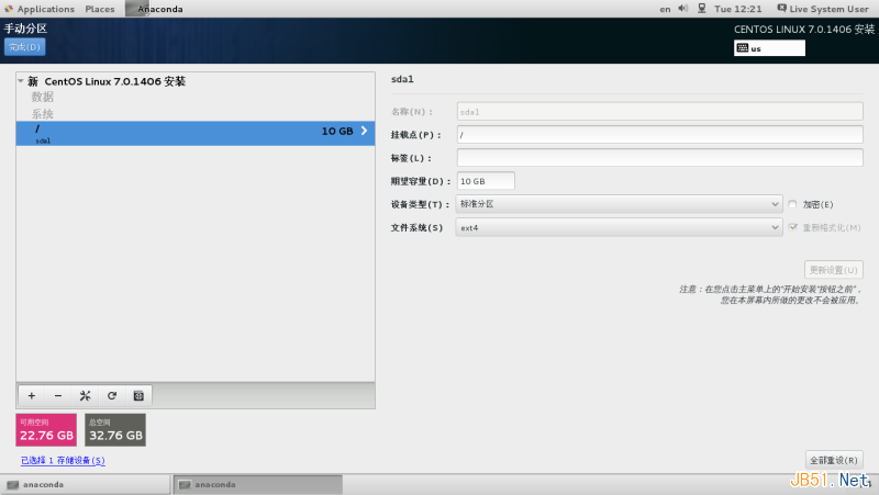 第三步、安装Fedora 21,还是选择自己配置分区,还是只要一个分区挂载到根目录,如下图: