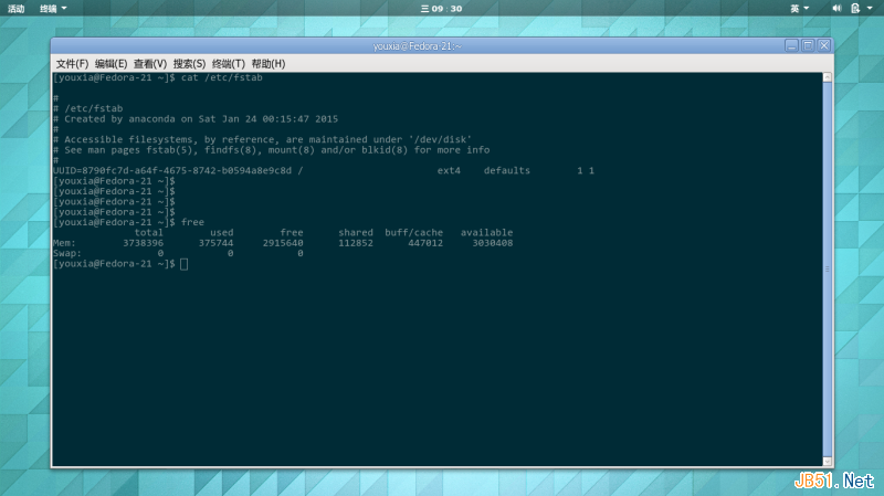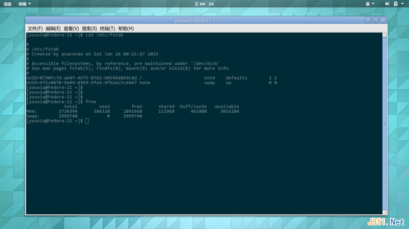 第五步、分别进入CentOS系统和Fedora系统,修改/etc/fstab文件来设置交换分区。设置之前,free命令的输出效果和/etc/fstab文件的内容是这样的: