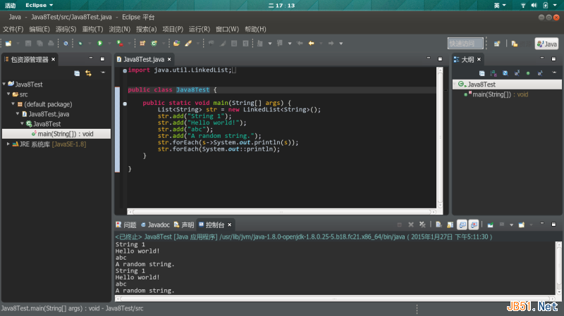 Fedora 21中Eclipse是4.4,OpenJDK是8,所以,安装一个Eclipse,写一个Lambda测试一下,效果不错,如下图: