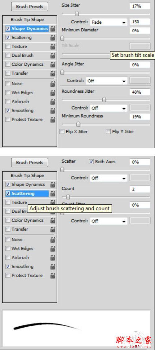 在这一步中,继续绘制更加多的船杆。选择画笔工具,然后选择硬度较高的画笔类型,然后如下图所示,打开画笔属性面板,勾选动态形状,设置大小抖动17%、控制渐隐150、圆度抖动48%、最小圆度19%。继续勾选散布,设置数量为2,其余默认。