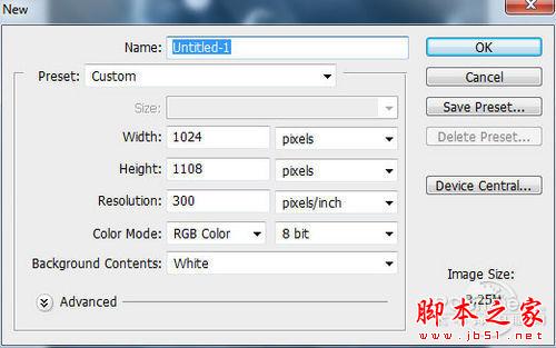 整个船身差不多制作完毕,下面就要制作整个鬼船起航的场景了。首先新建画布,设置长宽分别为1024像素和1108像素,设置如下图所示。