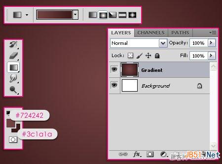 在背景层上面新建一个图层,命名为“渐变”。设置前景色为#724242,背景色#3c1a1a,然后,创建一个径向渐变,从文档的中心拖到其中一个角部。