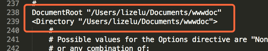 接下来我们就要配置我们的Apache服务器了,当然,主要还是Apache2.4与PHP7.0的关联。上面也提到了,本篇博客我们主要对httpd.conf文件的配置。首先打开/usr/local/etc/apache2/2.4/httpd.conf文件,也就是Apache2.4的相关配置文件。