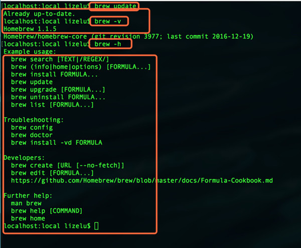 下方首先进行了brew update的更新操作,提示我当前的brew是最新的版本。我们可以通过brew -v来查看当前的brew版本。如果你对brew使用的不熟的话,可以使用brew -h来查看brew的相关命令操作。具体如下所示: