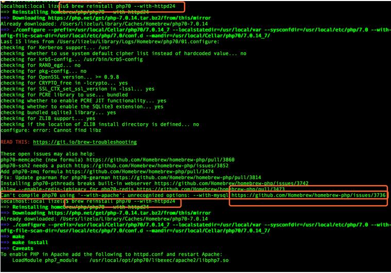 下方是我在安装PHP7.0时遇到的一个错误,直接使用brew install php70就可以安装成功,而添加上--with-http24就会报下方的错误。在下方的错误提示中,给出了解决问题的相应连接“https://github.com/Homebrew/homebrew-php/issues/3736”。在此github连接中找到了相应的解决方案,在终端执行xcode-select --install后,再reinstall就OK了。