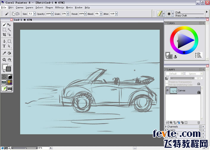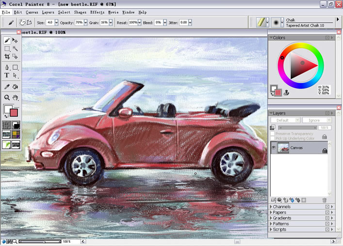 脚本之家的朋友大家好,这篇教程是我给大家整理的painter画笔系列之Chalk(色粉笔)篇。Chalk(色粉笔)是Painter 8新增的一组笔刷,之前的版本都是属于Dry Media里面的变体。Chalk的感觉和Conte,Charcoal的感觉差不多,质感适中,很适合随意生动的粉彩画的绘制。结合Coarse Distorto之类的混色扭曲变体可以创作出丰富的肌理效果和生动的笔触。 教程用Chalk(色粉笔)绘制了一辆甲壳虫敞篷车,希望脚本之家的朋友们喜欢。先看看最终的效果图: