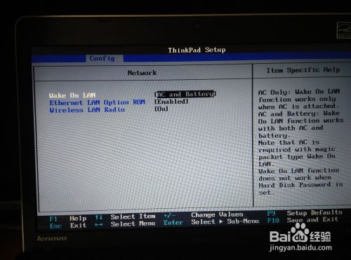 3、进入到该界面后,会看到3个选项,可以先读一下右边的“Item Specific Help”帮助理解这三个选项的意思,“AC Only”只有在接电源适配器的情况下,网络才会启用,如果只是使用笔记本的电池的话,则无法打开无网网络;“AC and Battery”表示接电源适配器或者电池都能够开启无线网络。最关键的地方是“Wireless Lan Radio”要选择On,只有这样才能开启无线网络。我的电脑不知道为什么突然更改了这两个选项。