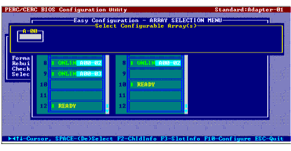 8. 将出现标题为“Select Configurable Array(选择可配置阵列)”的窗口。 该窗口显示阵列和阵列号,例如A-00。按<F2>,可显示阵列中的驱动器数量以及它们的通道和标识号,按<F3>,可显示阵列信息,例如:磁条、插槽和可用空间。