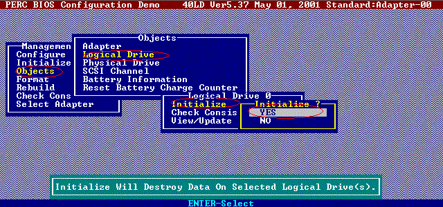 23. 初始化刚刚配置的逻辑驱动器。 选择Objects-logical driver.在需要做初始化的逻辑驱动器上回车,选择Initialize.确认回车