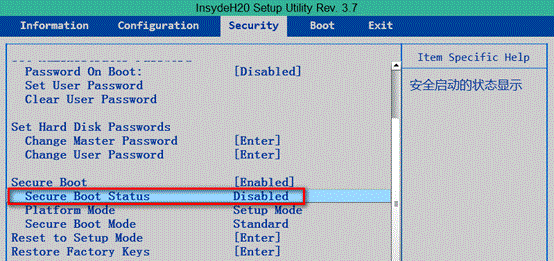 在Security菜单项下Secure Boot Status为关闭状态,且不可更改。如下图: